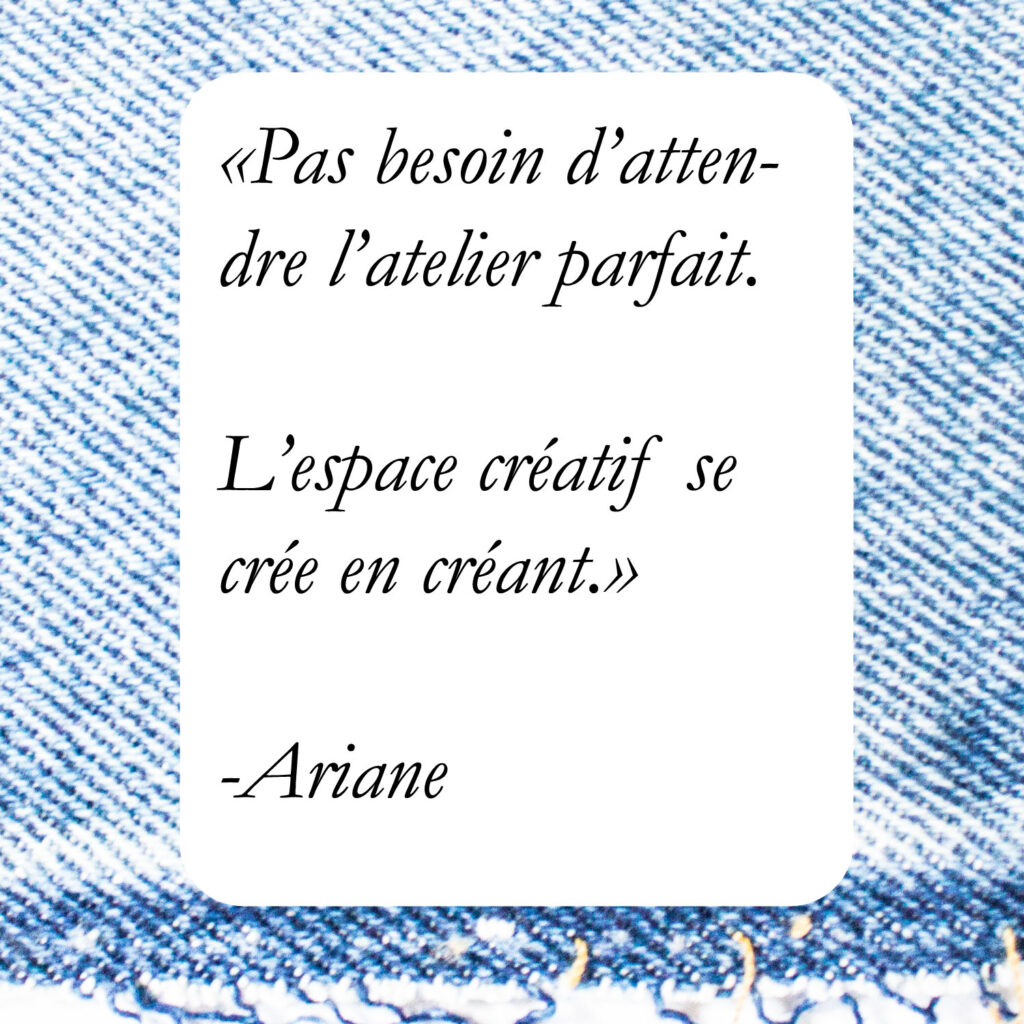 Qu’il s’agisse d’un sous-sol complet, d’un cabanon de couture, ou même d’un coffre de couture (oui, ça pourrait bien être le plus petit studio depuis lequel j’ai jamais travaillé), ces espaces sont des lieux de bonheur qui accueillent notre curiosité, notre patience (ou impatience lol) et notre désir de créer.