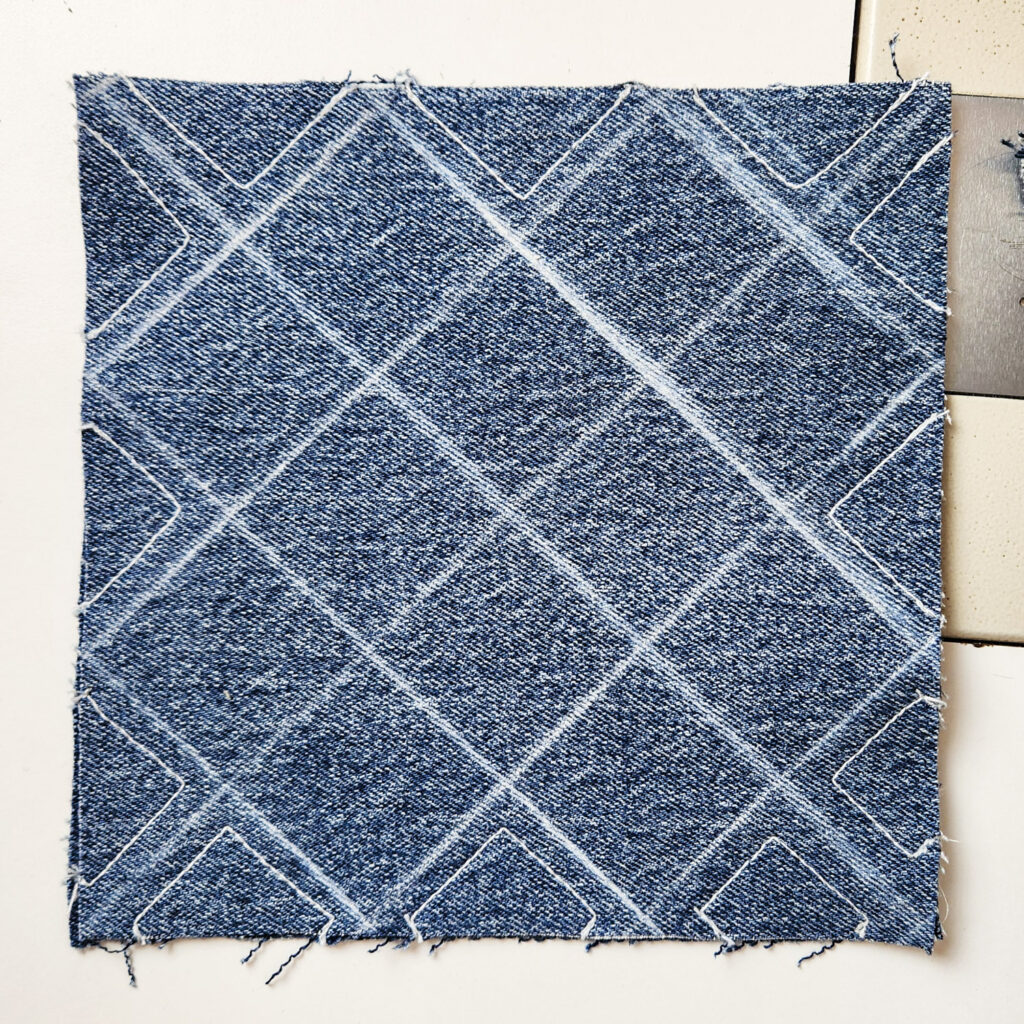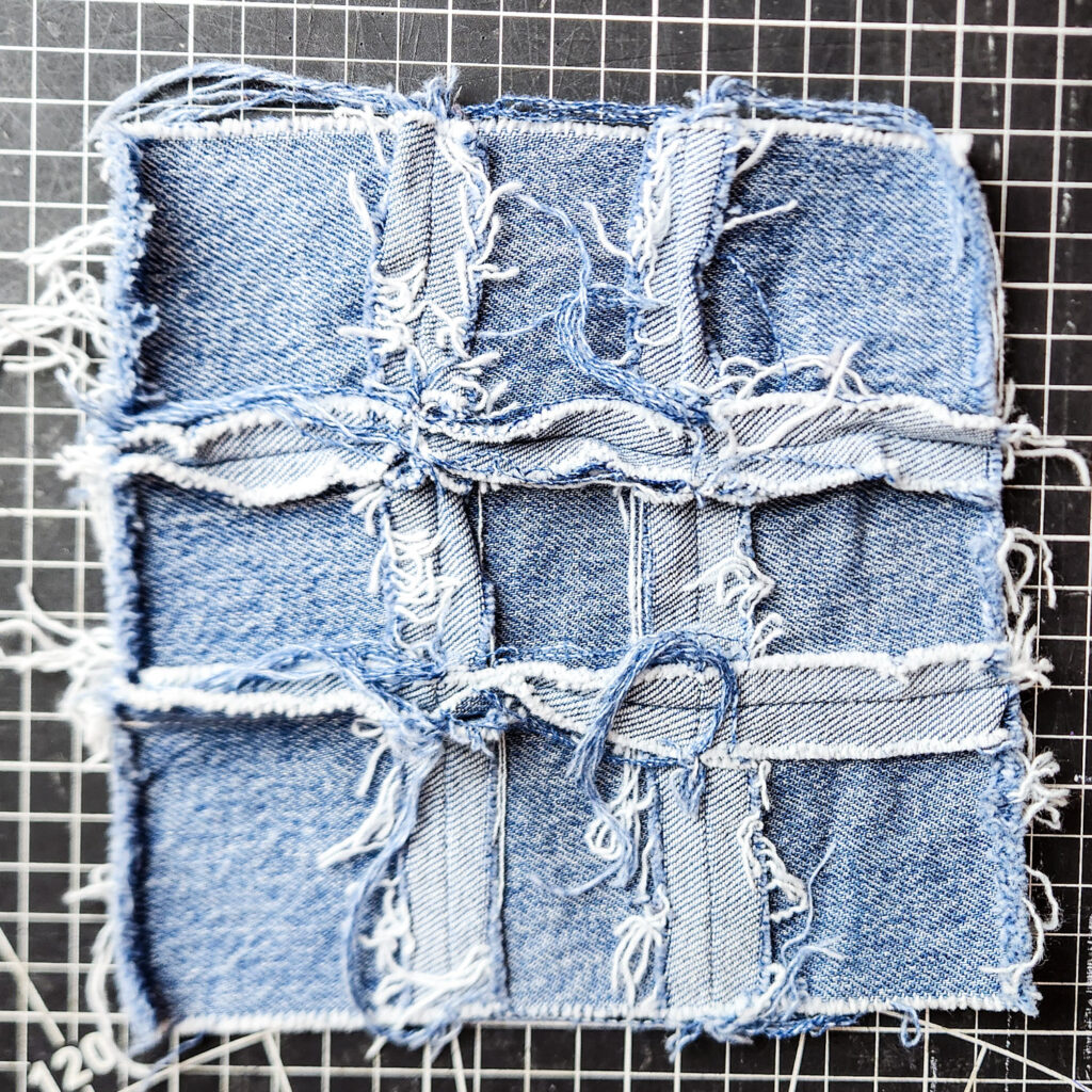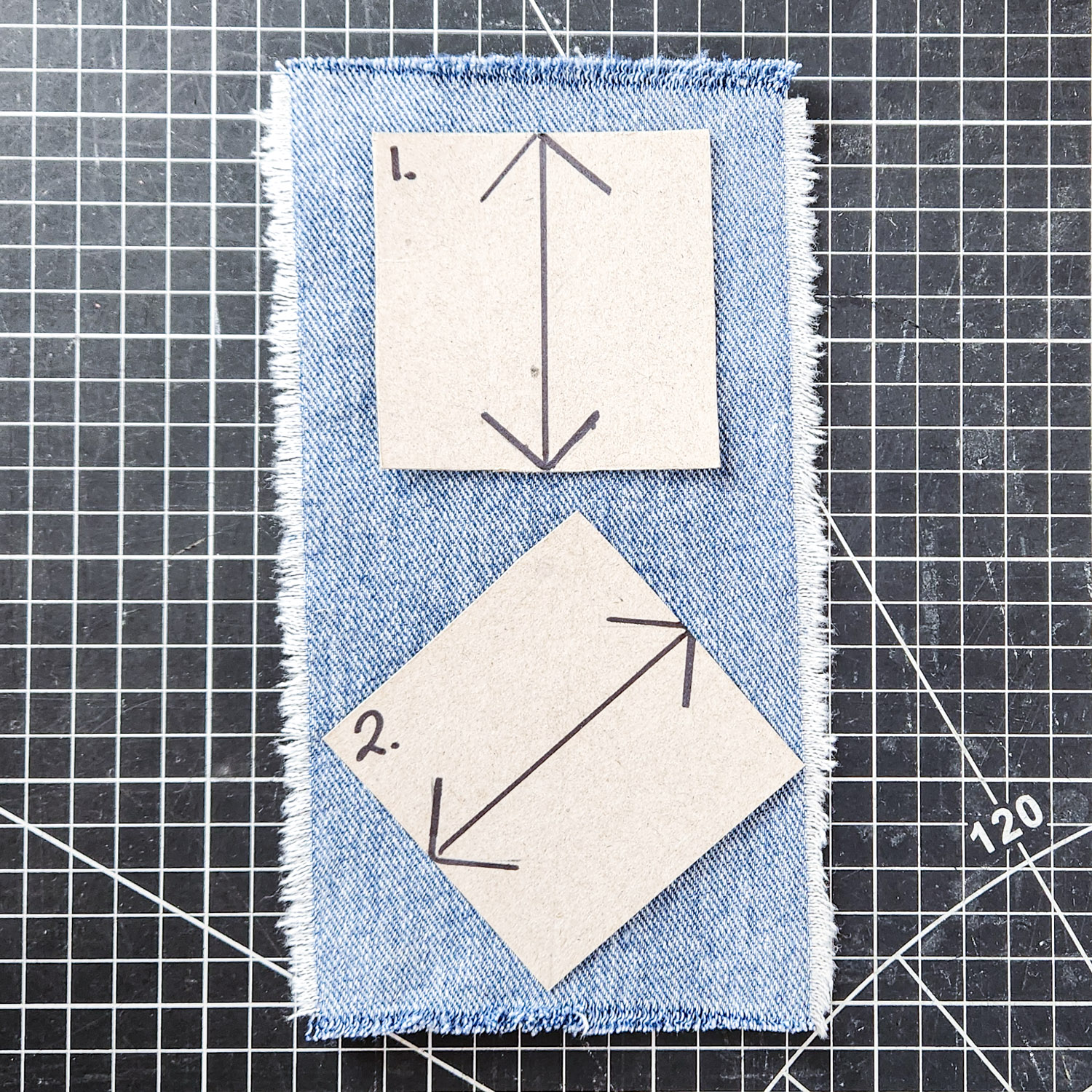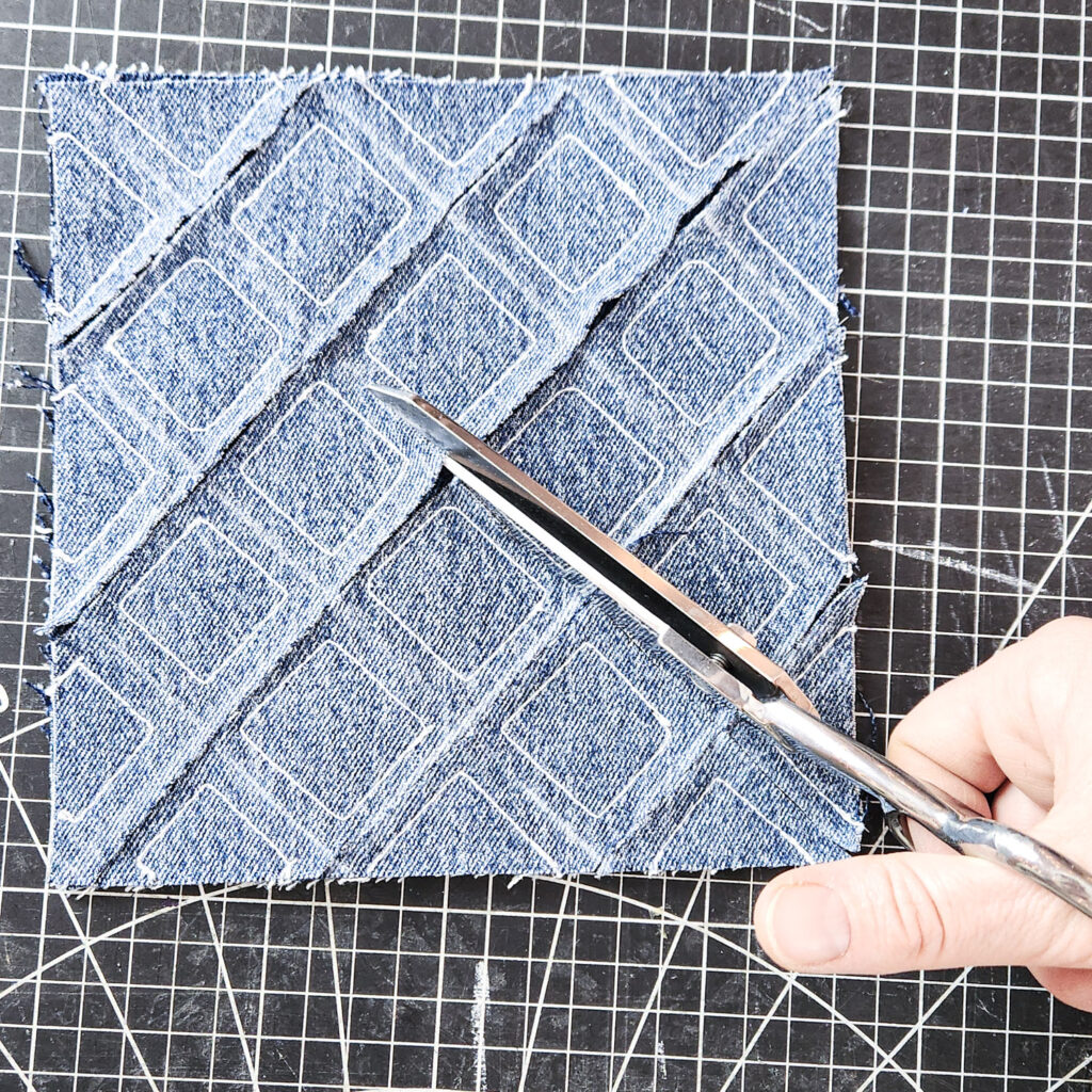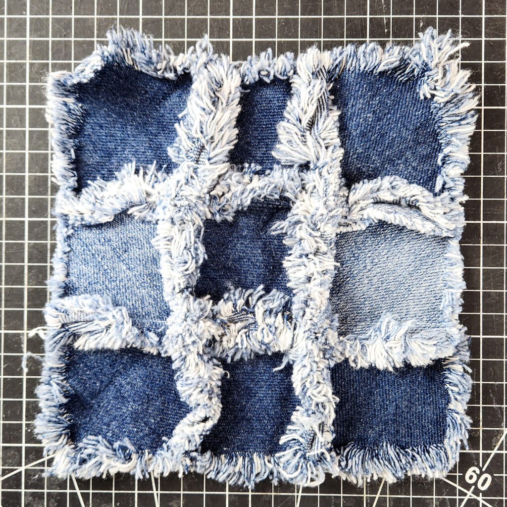 - Peter : Coupez les carrés de denim dans le biais, pas dans le droit-fil. Le biais permet aux bords de s’effilocher sans se défaire.