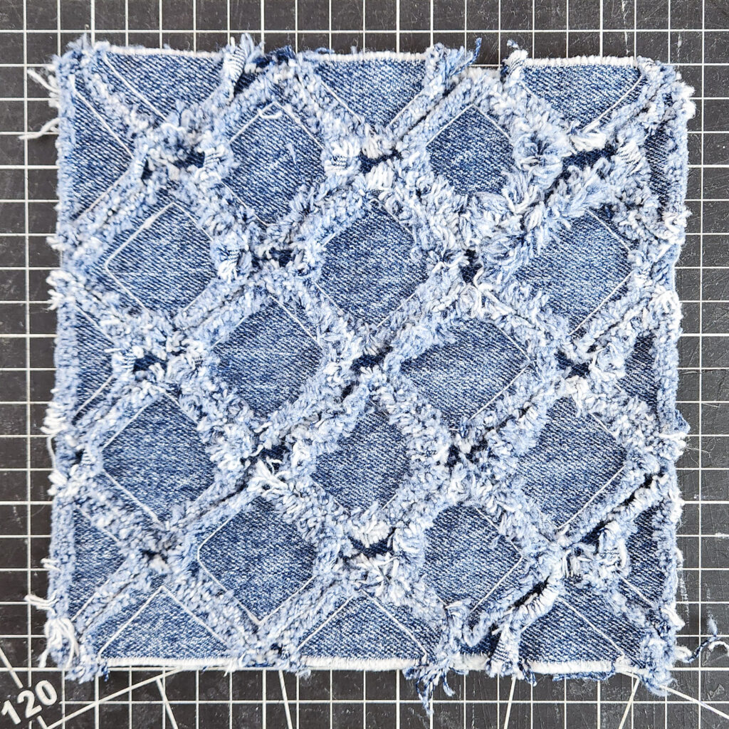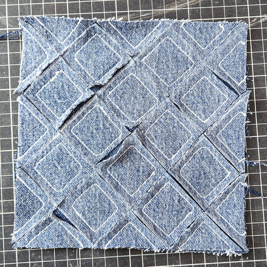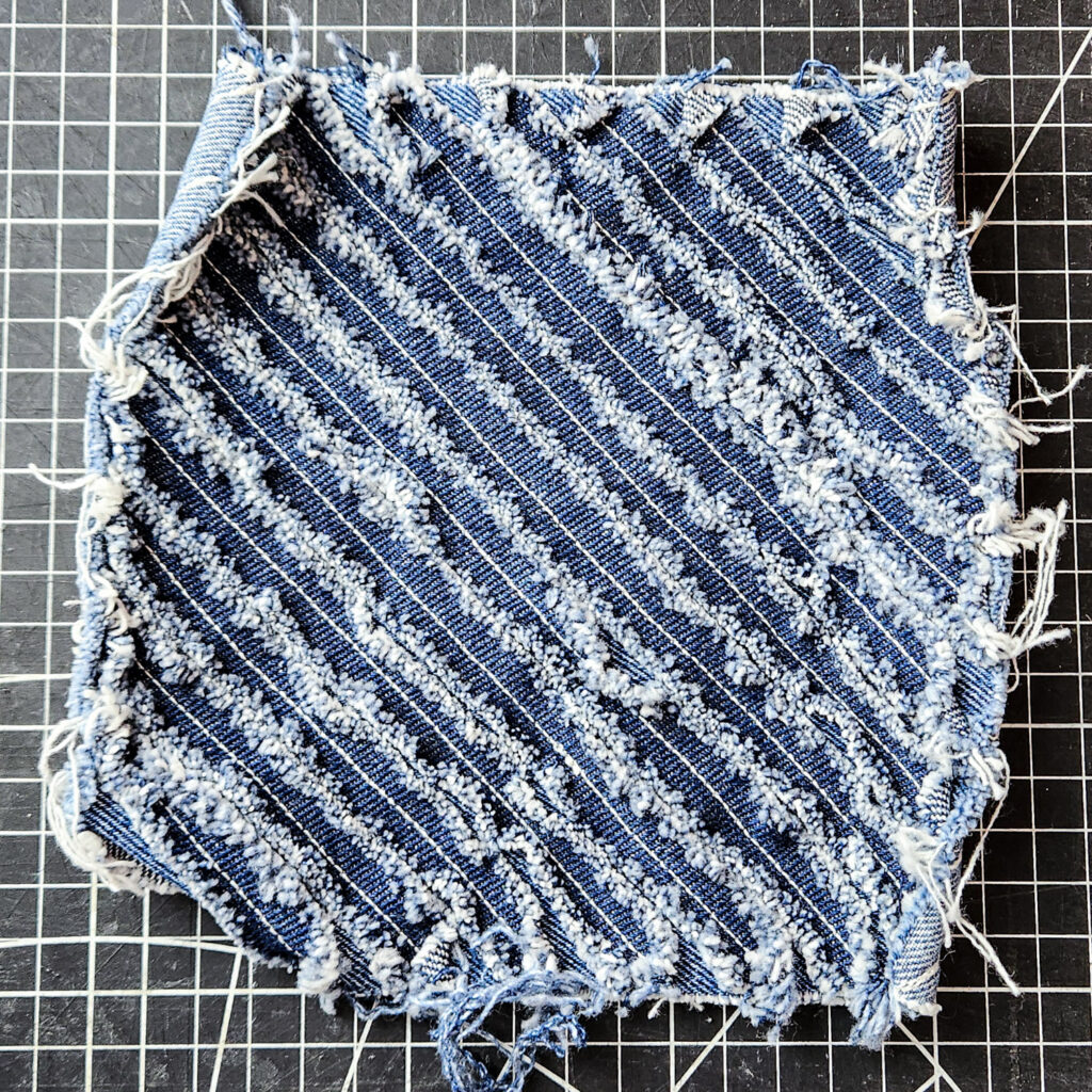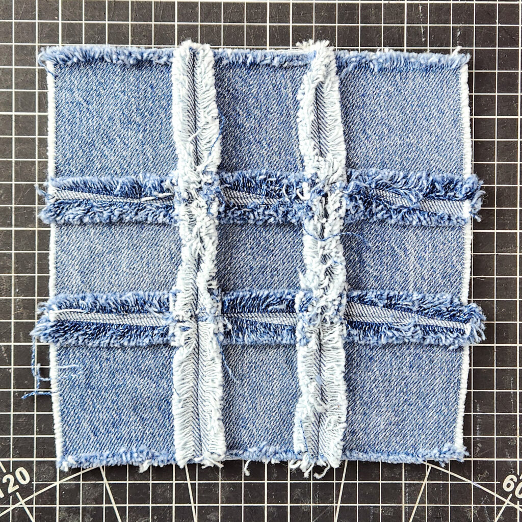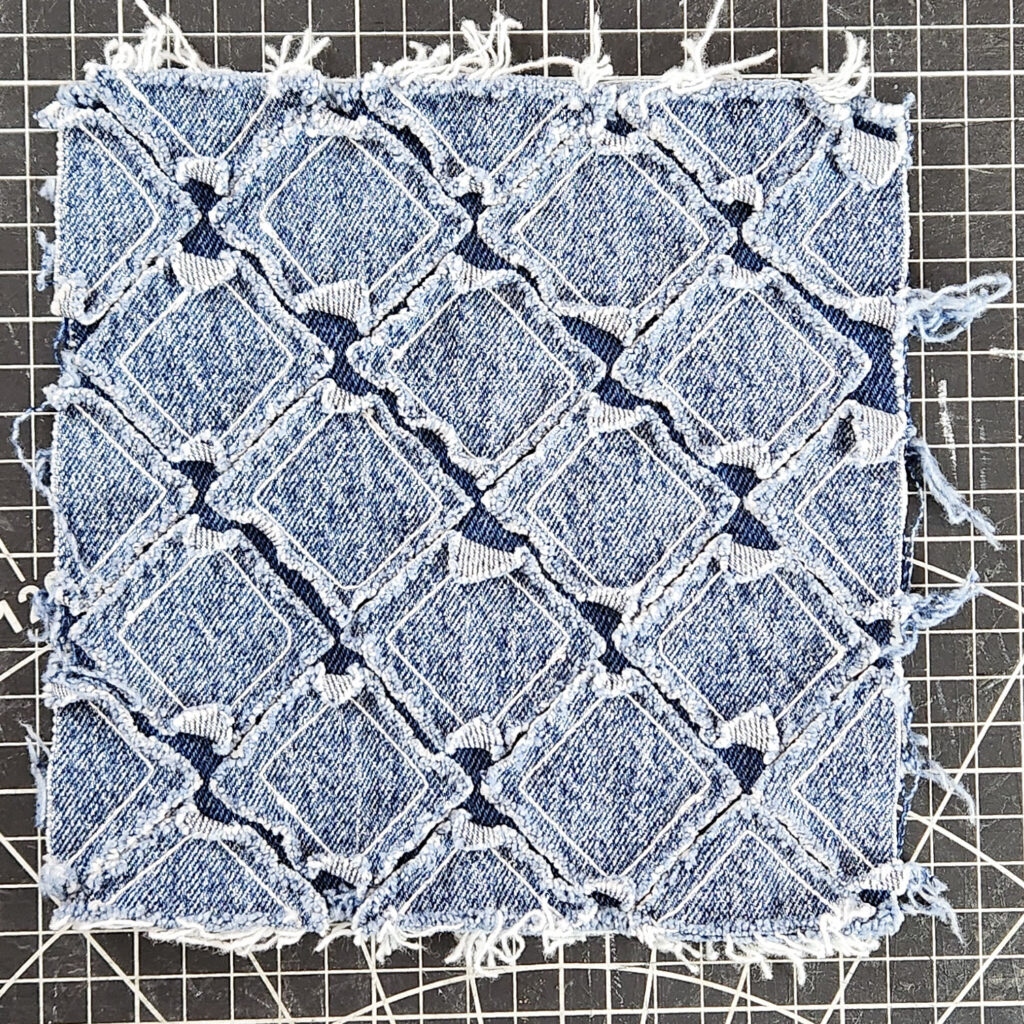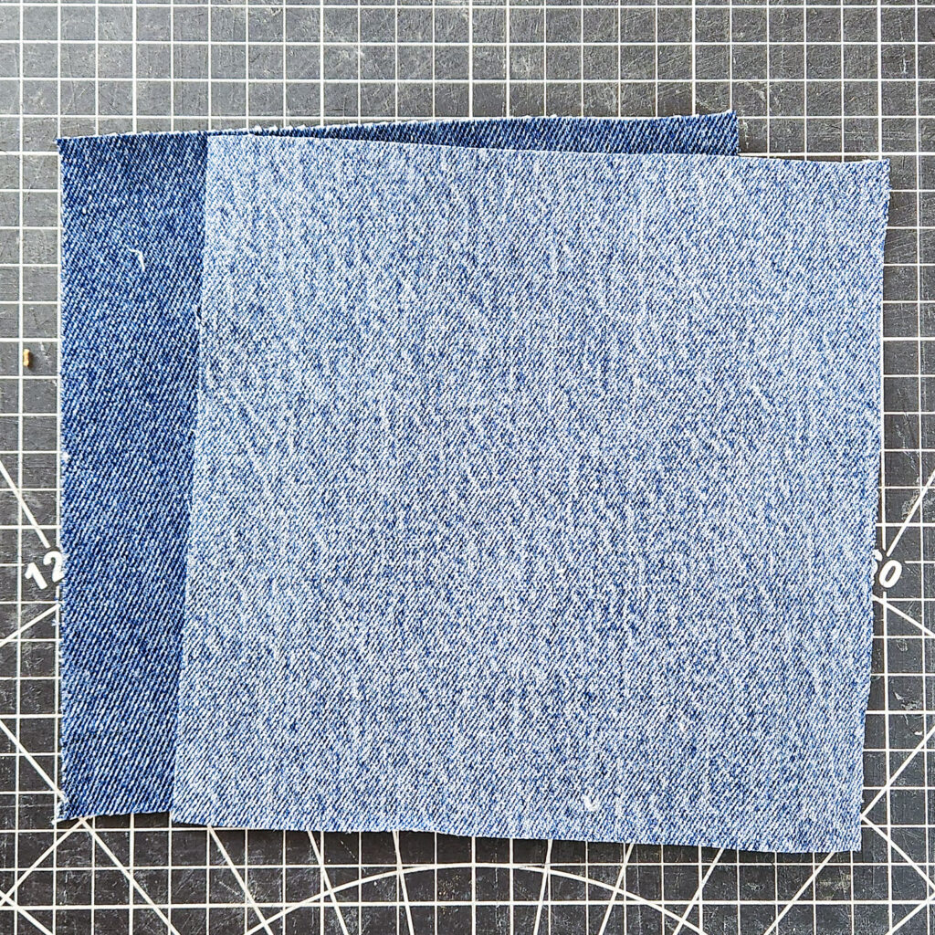 - Peter : Coupez les carrés de denim dans le biais, pas dans le droit-fil. Le biais permet aux bords de s’effilocher sans se défaire.