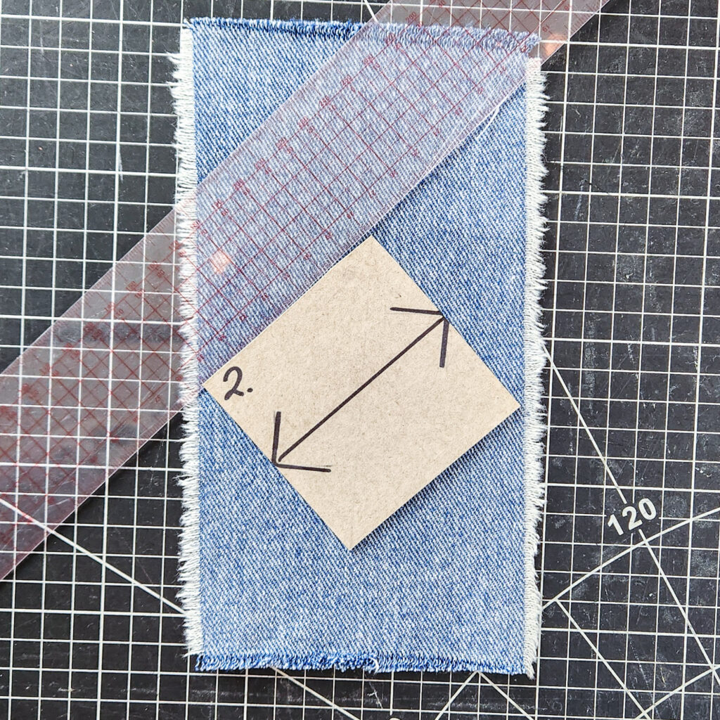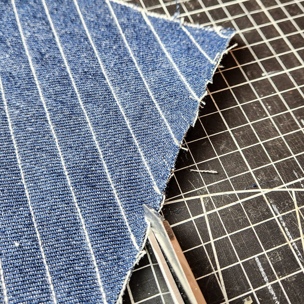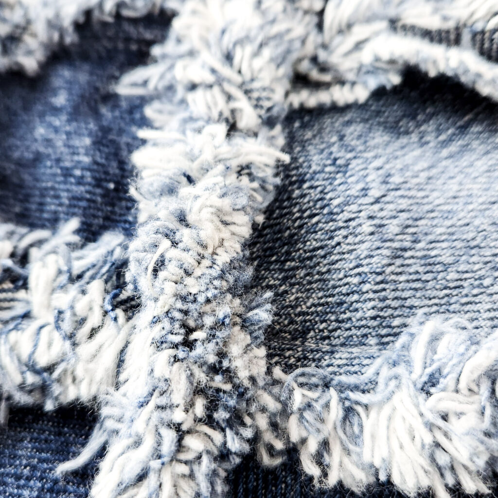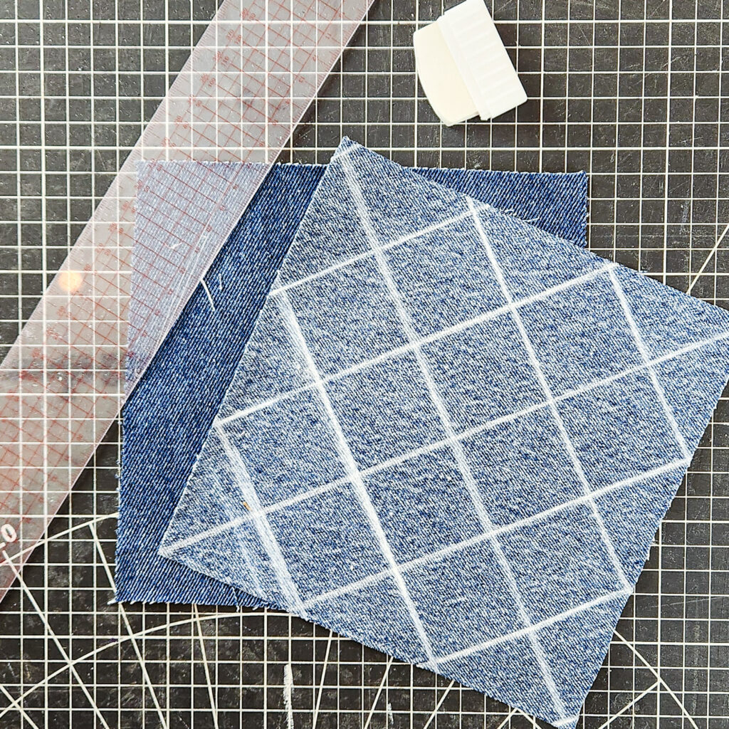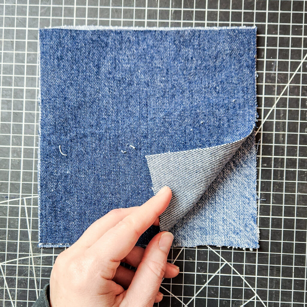 - Peter : Coupez les carrés de denim dans le biais, pas dans le droit-fil. Le biais permet aux bords de s’effilocher sans se défaire.