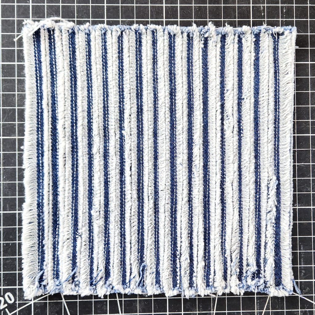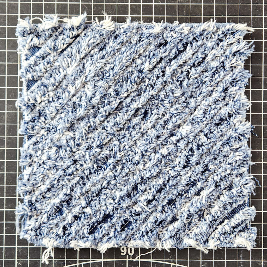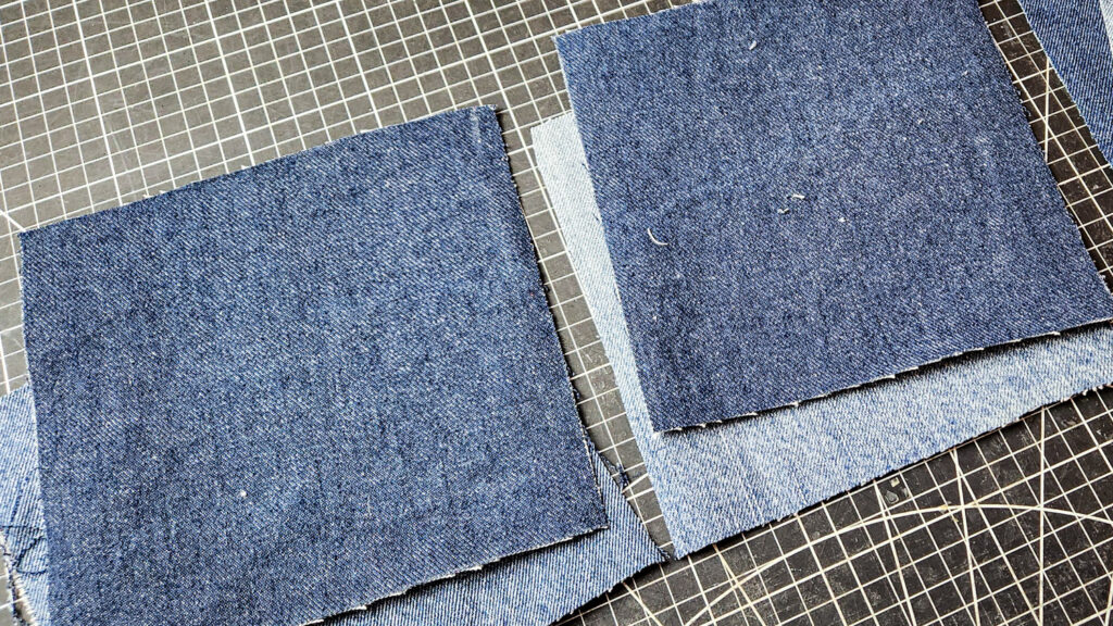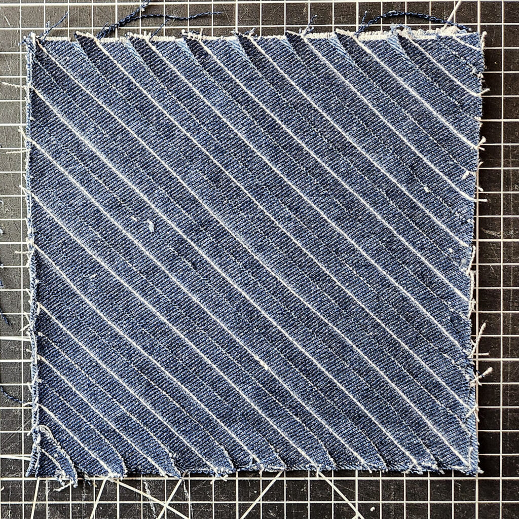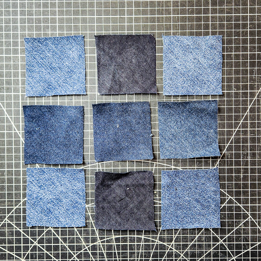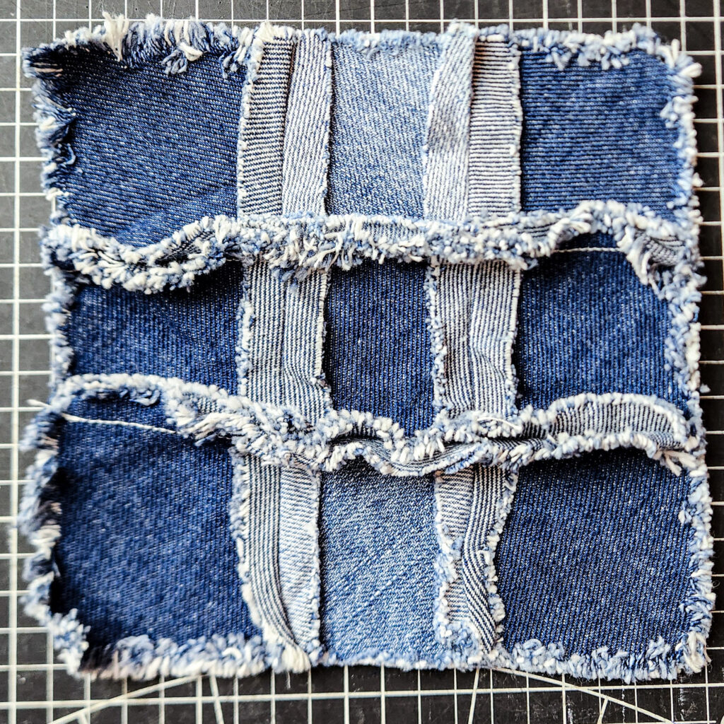 - Peter : Coupez les carrés de denim dans le biais, pas dans le droit-fil. Le biais permet aux bords de s’effilocher sans se défaire.