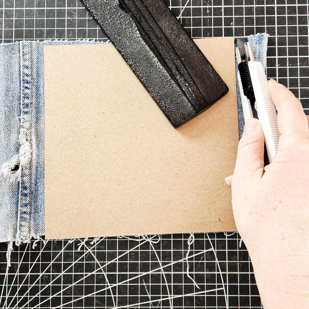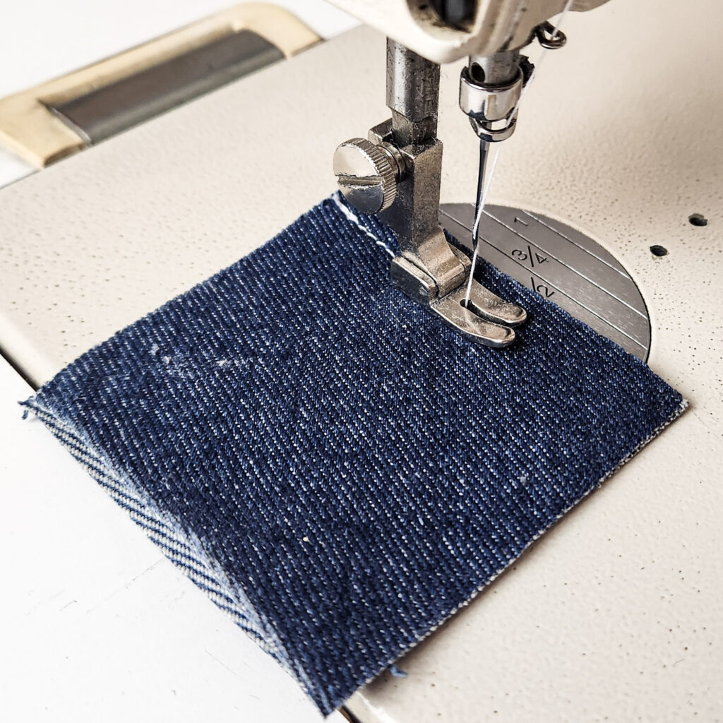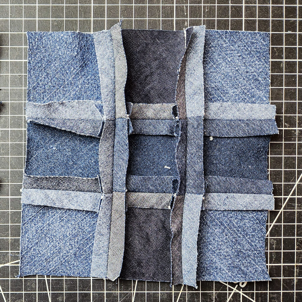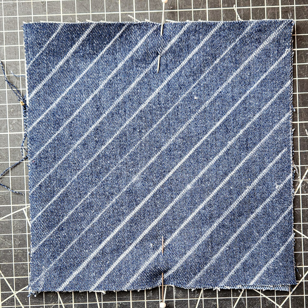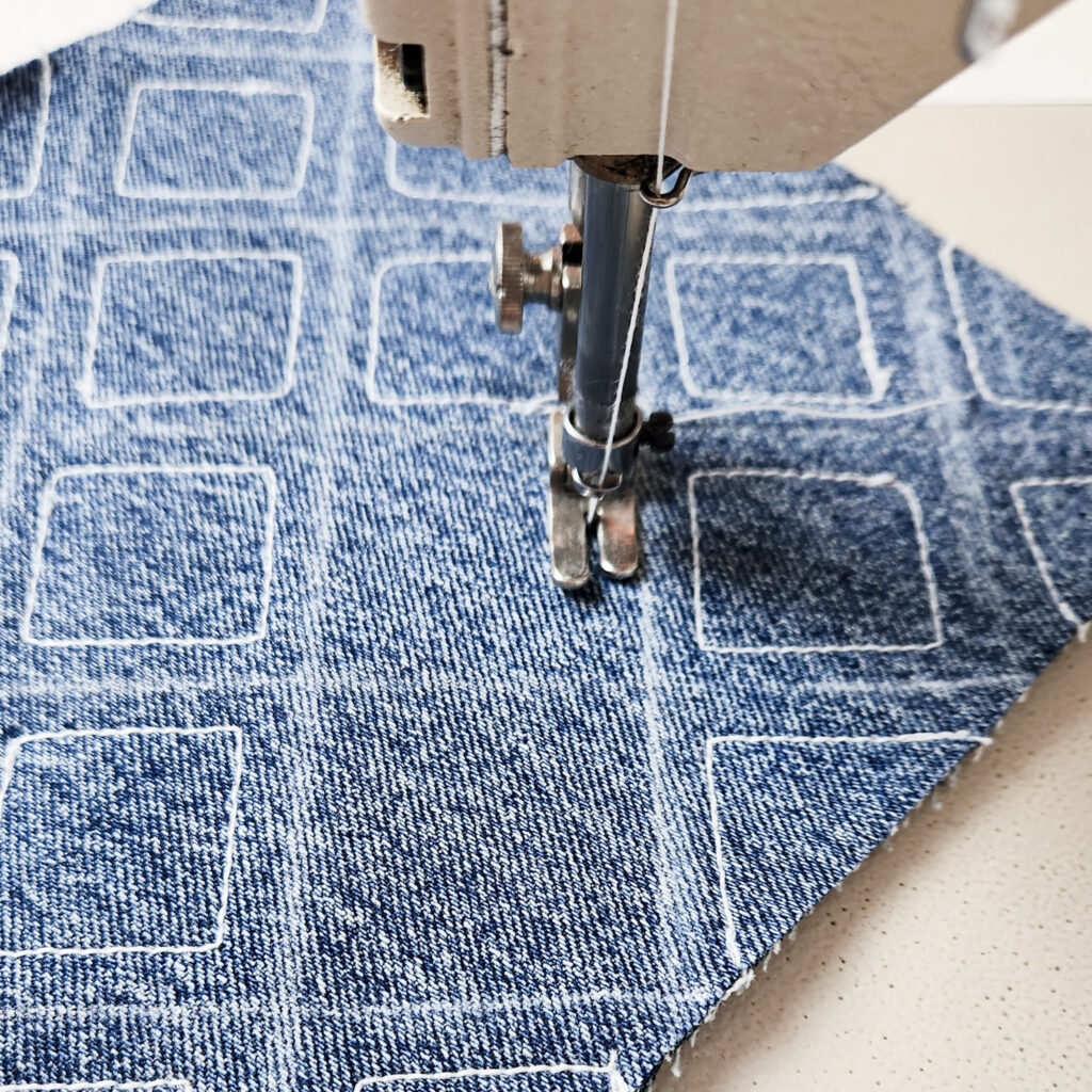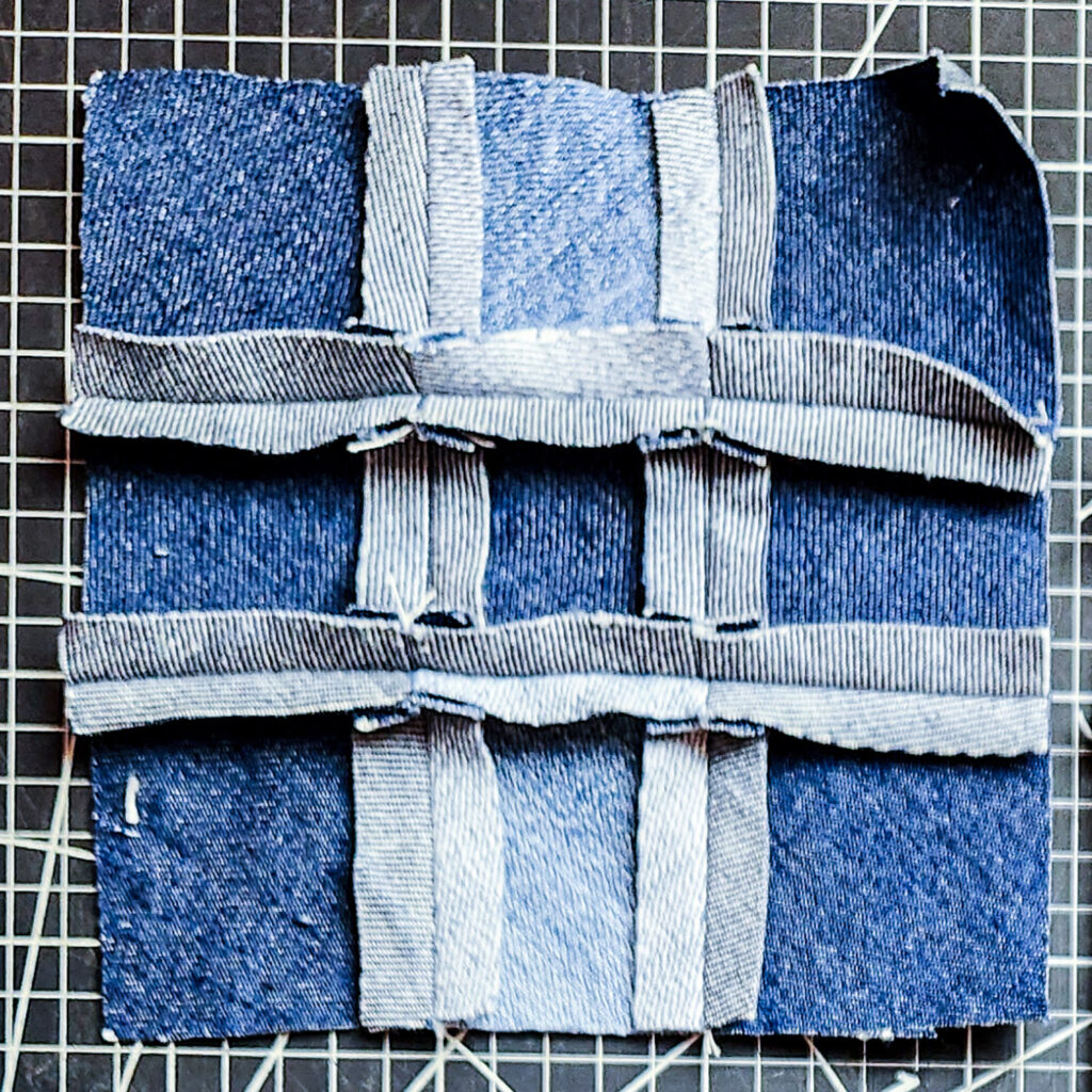 - Peter : Coupez les carrés de denim dans le biais, pas dans le droit-fil. Le biais permet aux bords de s’effilocher sans se défaire.