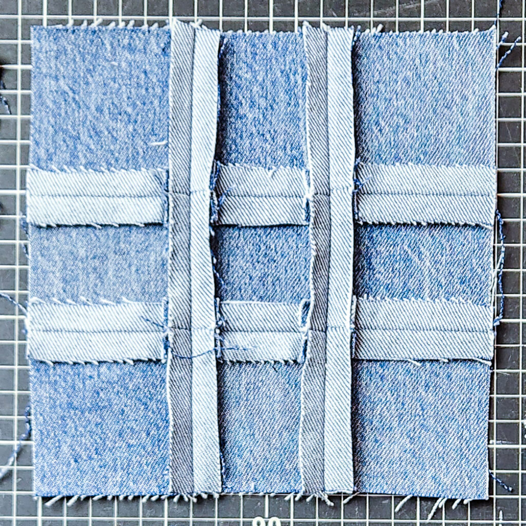 Pour mes échantillons, j’ai utilisé des carrés de 7,5 × 7,5 cm, qui ont donné des blocs de 18 cm une fois assemblés.