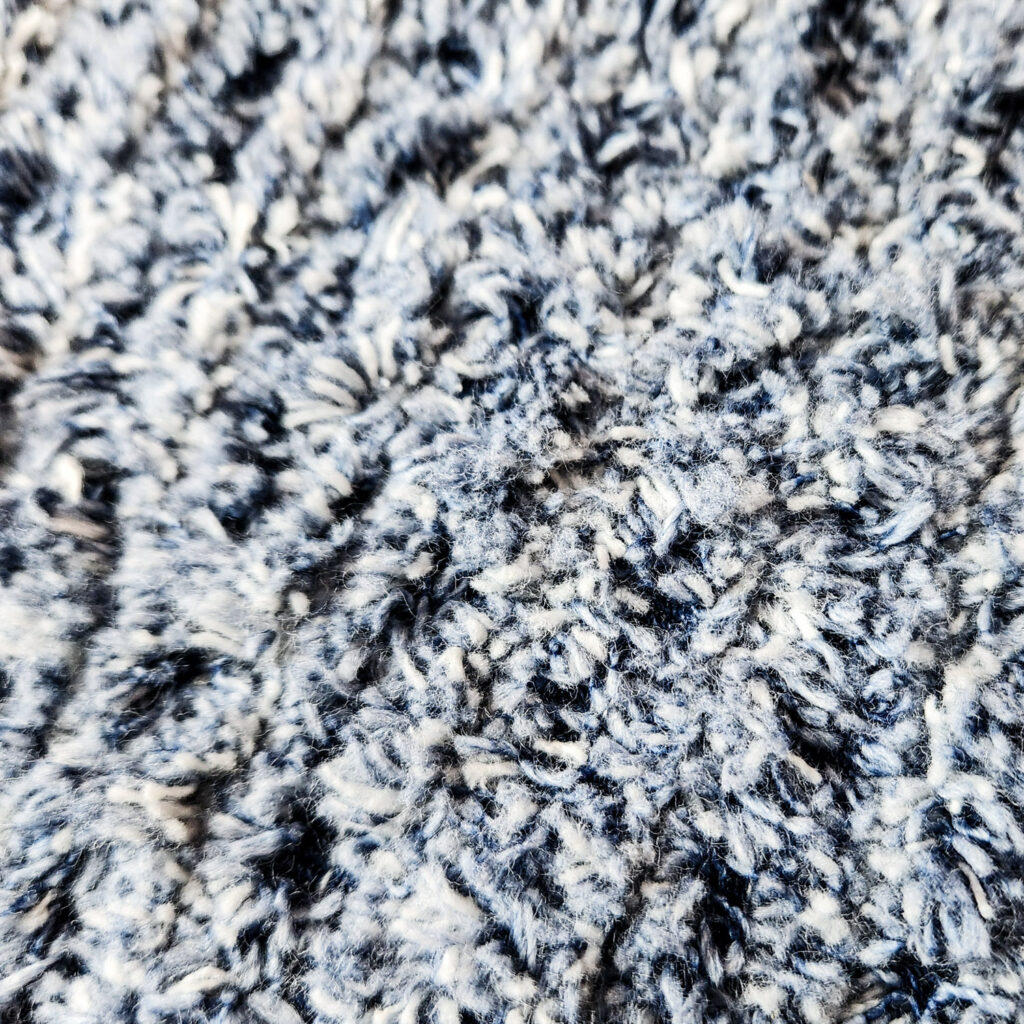 Échantillon Mimi : Les coutures effilochées sont bicolores et duveteuses donnant un aspect chaleureux et ludique.