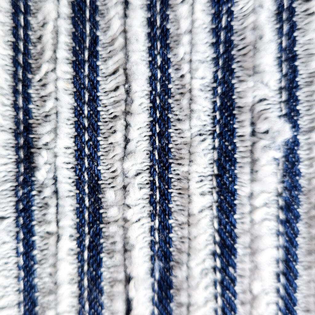 Échantillon Lili : Effilochage subtil révélant les fils blancs en trame et les fils indigo en chaîne.