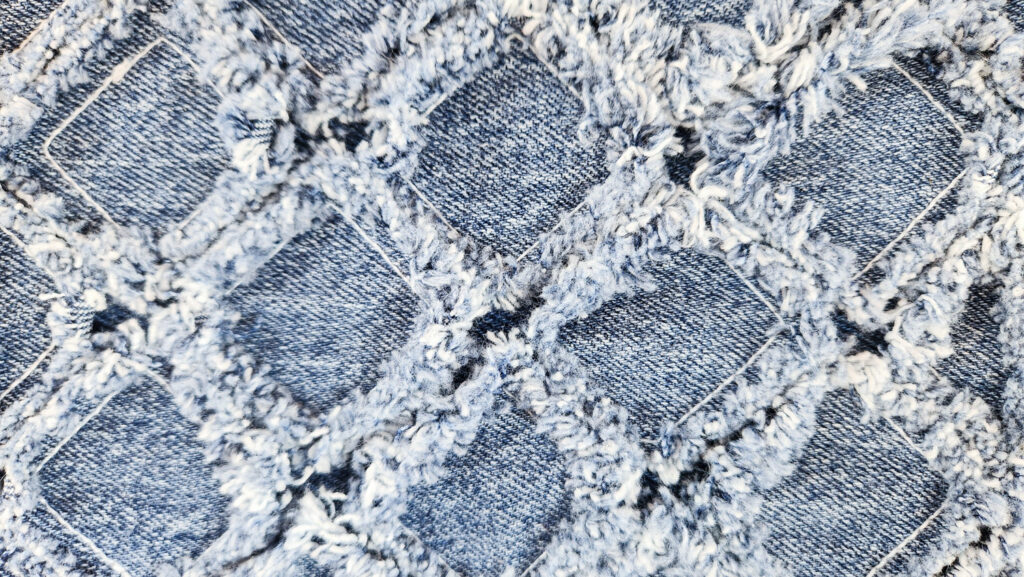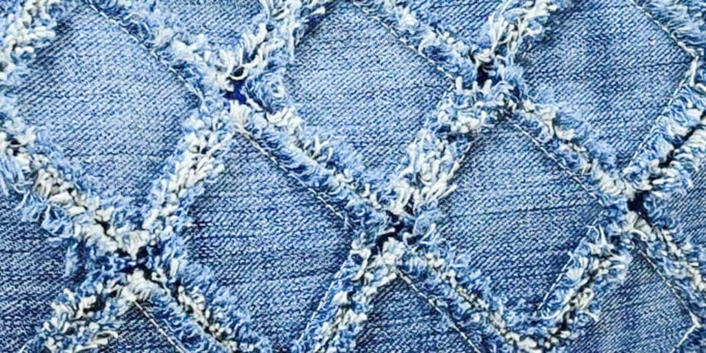 Les valeurs de coutures sont ensuite frangées, effilochées et lavées, créant un effet doux et texturé qui caractérisant cette technique.